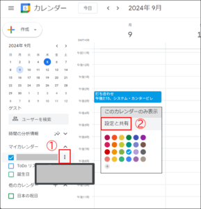 - 「マイカレンダー」からアクセス権を変更するカレンダーの「︙(三点リーダー)」をクリックし、ポップアップの「設定と共有」をクリックします