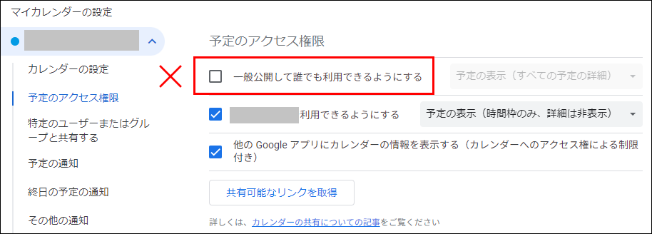 予定のアクセス権では一般公開を設定しない