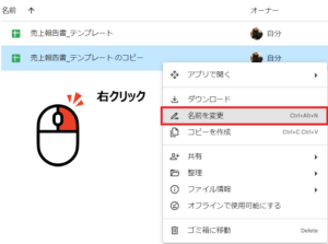 - コピーしたいスプレッドシートを選択し、右クリック → 「コピーを作成」をクリックします