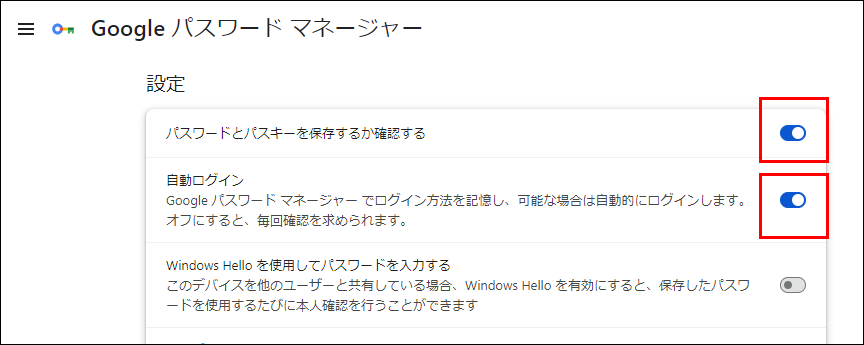 - 「パスワードとパスキーを保存するか確認する」と「自動ログイン」を「ON」にします