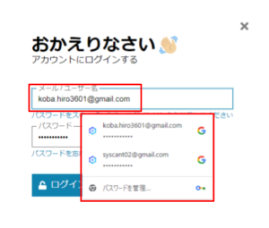 - 同じサイトで、複数のユーザーとパスワードが保存されていた場合は、ユーザー名をクリックすると、保存されているユーザー名とパスワードが表示されます