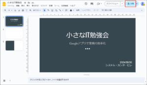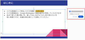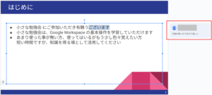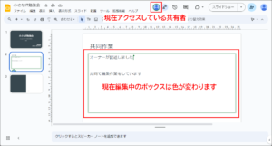 プレゼンテーションを共有すると、共有したメンバーで、同時に編集できるようになります。