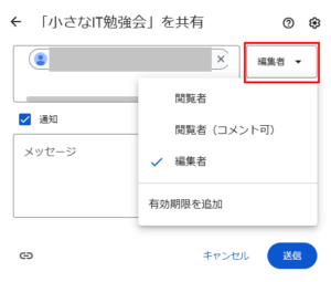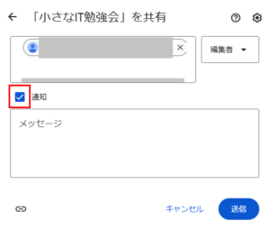 6.「通知にチェック」を入れて「送信」をクリックすると、権限を設定したユーザーにメールが送信されます
