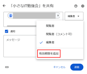 4.「有効期限を追加」をクリックすると、アクセス権の有効期限が設定できます