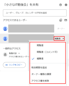 7. 各ユーザーの「権限 ▼」をクリックすると、設定した権限を変更できます(キーボート「esc」を押下すると、権限設定のポップアップが閉じます)