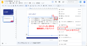 1. コメントする部分を範囲選択して「右クリック」>「コメント」をクリックします