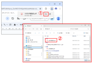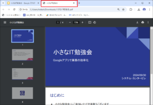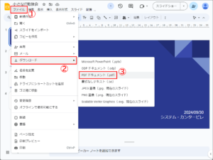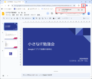 Slide スライドをPDFにする 2024.09.05 2024.10.18 GoogleスライドでPDFを作成する方法を記載します。 1. 「ファイル」>「ダウンロード」>「PDFドキュメント」をクリックします 2. PDFがダウンロードされます 3. フォルダマーク をクリックすると、ダウンロードされたフォルダが表示されます 4. リンクマーク をクリックすると、Webブラウザの 新しいタブ でPDFが表示されます 表を挿入する スライドを印刷する