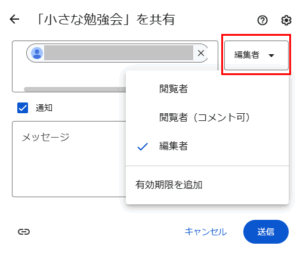 修正を手伝ってもらうメンバーに、閲覧者(コメント可)の権限を設定します。