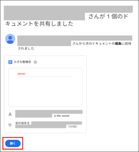 共有した旨のメールが届いている場合は、「開く」をクリックすると、文書が開きます