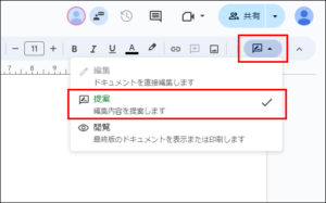 1. 閲覧者(コメント可)の権限を設定されているメンバーが文書を開くと、提案モード になります