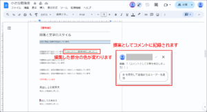 2. 閲覧者(コメント可)の権限を設定されているメンバーが文書を編集すると、編集した部分の色が変わり、編集内容が「提案」として「コメント」に記録されます