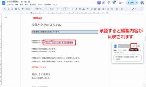 3. 文書の所有者(オーナー)が提案を「承認」すると、編集内容が反映され、色が変わっていた部分が元の色に戻ります