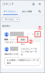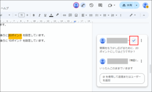 5. 文書の所有者(オーナー)が「解決レ点」をクリックすると、コメントの表示から消えます