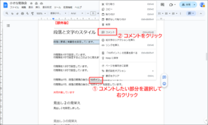 1. コメントする部分を範囲選択して「右クリック」>「コメント」をクリックします