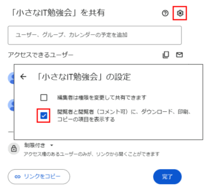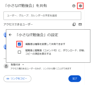 9. 編集者が権限を変更できないようにしたい場合は、「歯車マーク」>「編集者は権限を変更して共有できます」のチェックを外してください