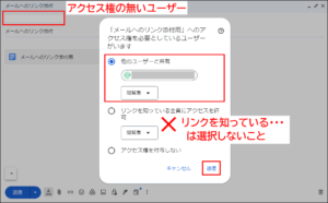 Googleドライブを使用してファイルへのリンクを送る場合は(ドライブを利用してファイルを挿入)、メール送信者にアクセス権が無いとき、アクセス権を設定する画面が表示されるので、適正なアクセス権を付与してください。